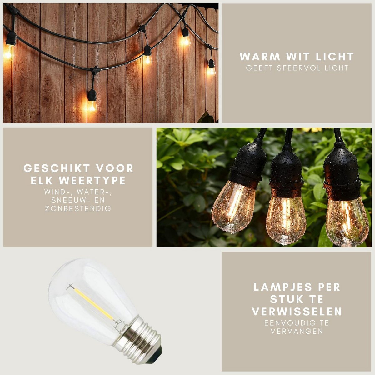 Beenden Sie Ihren Tag mit dieser stimmungsvollen Beleuchtung. Egal, ob Sie im Garten oder auf Ihrem Balkon entspannen, eine schöne Party schmeißen oder das Vorzelt des Wohnwagens schön beleuchten möchten, diese Lichtschnur ist ein echter Hingucker. Genießen Sie eine gemütliche Atmosphäre dank der 10 gläsernen, birnenförmigen LED-Lampen mit warmweißem Licht. Regnerische Tage? Kein Problem. Die Lampen sind absolut wasserdicht.
