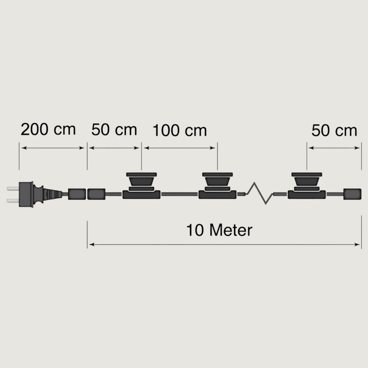 Mit einer Länge von 10 Metern sorgt die Lichtschnur für eine große Fläche mit stimmungsvollem Licht. Die Lampen bestehen zu 100 % aus LED, was besser für die Umwelt ist und eine lange Lebensdauer gewährleistet. Sparen Sie Energiekosten dank dieser Beleuchtung mit grünem Charakter.