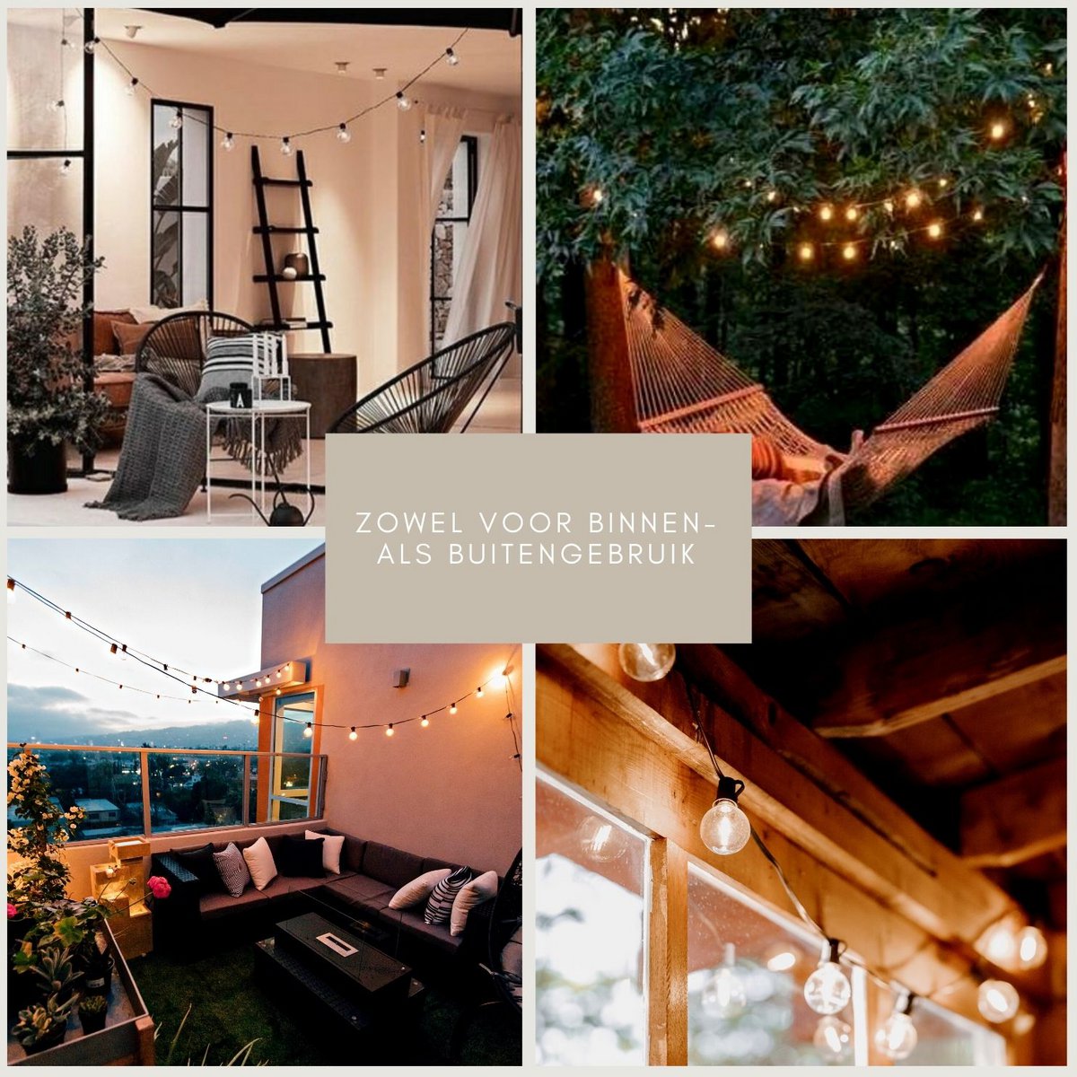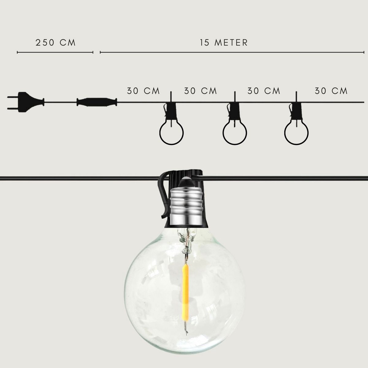 Beenden Sie Ihren Tag mit dieser stimmungsvollen Beleuchtung. Egal, ob Sie im Garten oder auf Ihrem Balkon entspannen, eine schöne Party schmeißen oder das Vorzelt des Wohnwagens schön beleuchten möchten, diese Lichtschnur ist ein echter Hingucker. Genießen Sie eine gemütliche Atmosphäre dank der 50 (+2 Ersatz-) Glas-XL-LED-Lampen mit warmweißem Licht. Regnerische Tage? Kein Problem. Die Lampen sind absolut wasserdicht.