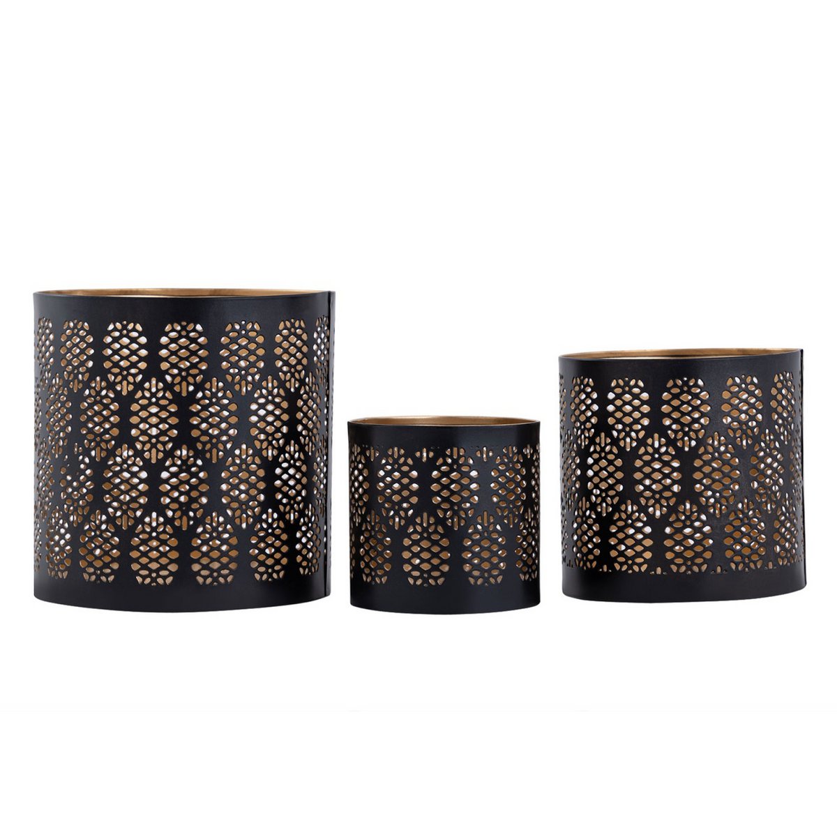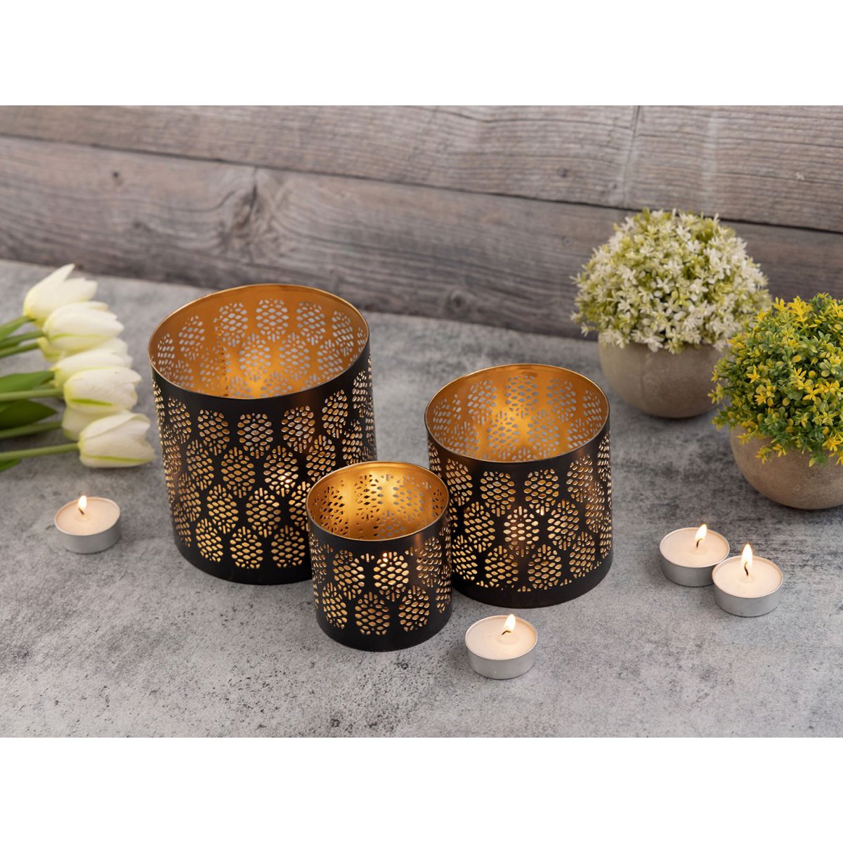 Das Windlicht-Set Orient bietet Platz für Teelichter, Blockkerzen und Stumpenkerzen und sorgt für eine angenehme Atmosphäre und schöne Lichtpunkte in Deinem Wohnzimmer, Deiner Küche oder auf Deiner Terrasse. Das schwarze Metallgestell ist mit goldenen Akzenten versehen und verleiht den Windlichtern eine besonders elegante Optik. Die Kerzenständer in schwarz und gold sind ein absolutes Must-Have für alle, die stilvolle und gemütliche Atmosphäre in ihrem Zuhause schaffen möchten. Die Windlichter sind nicht nur praktische Kerzenhalter, sondern auch dekorative Highlights in jedem Raum.